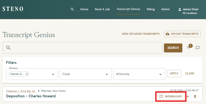 3. Click 'Interrogate' on any transcript to begin using Transcript Genius features.