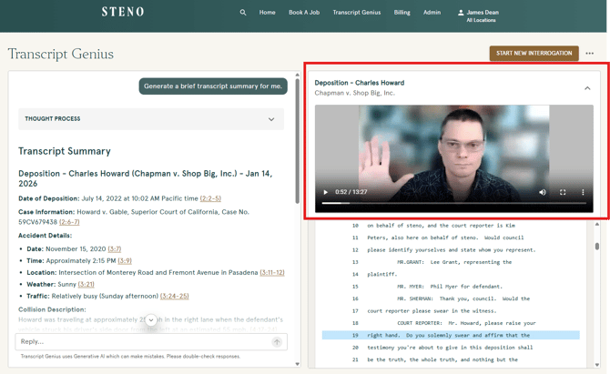 4. If a transcript includes both purchased video and Text-to-Video Sync (T2VS), the video will also be available directly on the transcript page. Learn more about How to Review Synced Video in Transcript Genius.